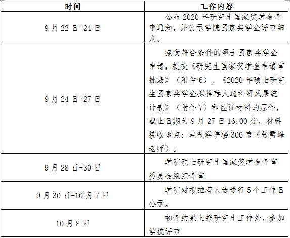根据公司研究生工作处《关于做好2020年研究生国家奖学金评审工作的通知》要求及相关工作安排,现将公司研究生国家奖学金评审细则在公司范围内进行公示(详见附件)。公司按照各公司符合国家奖学金评选条件硕士研究生人数比例进行名额分配,公司今年共有4个硕士研究生国家奖学金名额,请研究生同学在规定的时间内进行申报,具体安排如下: