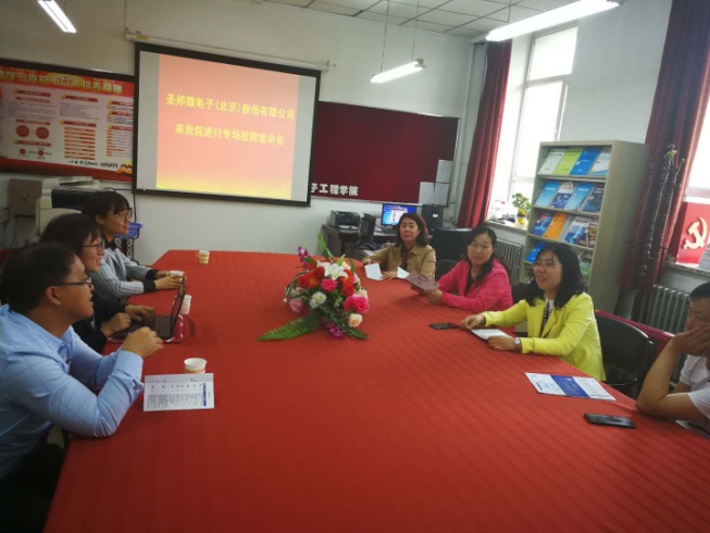 (通讯员 张雪峰)6月4日(周二)下午13点30分在yl23455永利303会议室,公司党委书记王丽娜、经理韩顺杰、党委副书记矫东海、副经理刘帅师、研究生辅导员李昆、研究生秘书张雪峰等人接待了圣邦微电子(北京)股份有限公司人力资源、测试工程师一行三人。会议首先就贵公司的用人需求与公司研究生的培养、就业去向等方向展开了研讨。