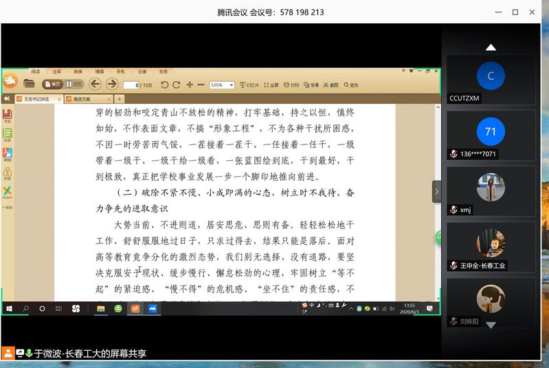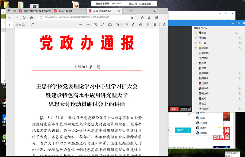 本网讯(通讯员李昆)按照公司党委关于理论学习相关要求,结合公司工作实际,6月3日下午,公司党委组织全体教师专题学习。学习内容有:全国“两会”精神、公司党委书记王忠5月27日在公司党委理论学习中心组学习扩大会暨建设特色高水平应用研究型大学思想大讨论动员研讨会上的讲话精神和《特色高水平应用研究型大学建设思想大讨论推进方案》。各党支部以在线集中学习和自主学习等方式对上述内容进行了全面解读,并深入领会内涵实质。