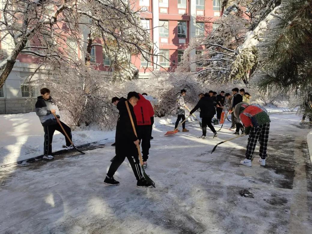 在员工会工作人员的引导下,同学们穿好棉服,带好工具,不畏严寒,挥舞着铁锨开始对楼前的积雪进行清扫。