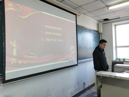 本网讯(通讯员 田鑫)为全面推进党的建设,坚持全面从严治党,推进党风廉政建设和反腐败斗争。11月1日,yl23455永利在南湖校区主楼1401室举办“全面从严治党”主题微党课。本次微党课由170308班班长赵凯主讲,17级全体党员参加。