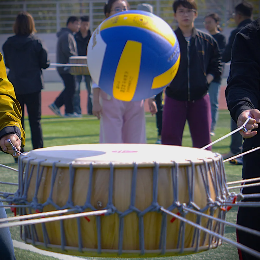 老师们拉紧绳子,神情专注地盯着即将落下的球。球触鼓面,“咚”的一声,拉开了激烈角逐的序幕。老师们齐心协力,随着球的跳动调整力度与方向,口号声整齐响亮。