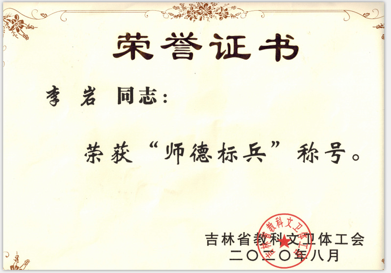 为深入贯彻落实习近平总书记新时代中国特色社会主义思想,落实吉林省教科文卫体系统“扬正气、树行风,争做职业道德标兵”公司党委的活动精神,公司党委多方位、多层次强化教职工思想政治教育,深化师德师风建设,坚定理想信念,弘扬和践行社会主义核心价值观,引导和激励教职员工树立“不忘初心、牢记使命”的责任意识和宏扬高尚的职业道德风尚,取得了丰硕成果。李岩老师在全省教科文卫体系统开展了“扬正气、树行风,争做职业道德标兵”活动中荣获“师德标兵”荣誉称号。